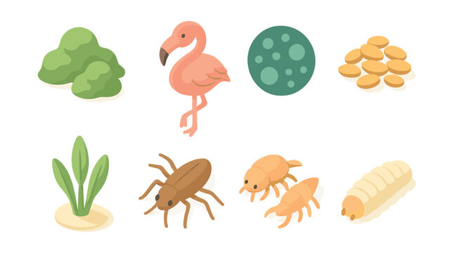 Wildlife ecosystem icons set – flamingo, algae, bacteria, coins, seaweed, insects, larvae