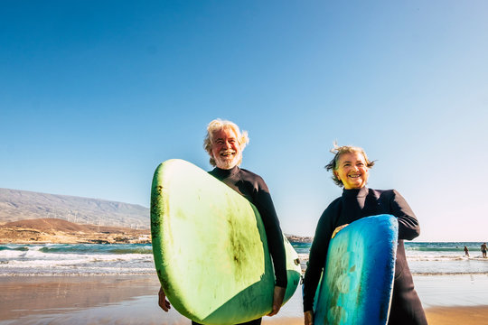 couple of seniors at the beach with black wetsuits holding a surftable ready to go surfing a the beach - active mature and retired people doing happy activity together in their vacations or freetime