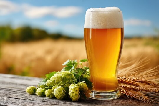 Glass of Light beer and Fresh green hops and ears of wheat and barley set. Hand drawn watercolor illustration isolated on white background