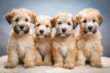 Soft coated wheaten terrier puppies beam with big eyes and wag their tails, posing for the camera with innocent charm and playful energy.