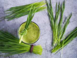 Fresh wheat grass juice and wheatgrass plant for health on top view. Nutrition food.