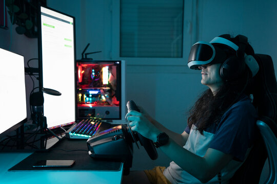 Man wearing VR glasses using steering wheel sitting at home