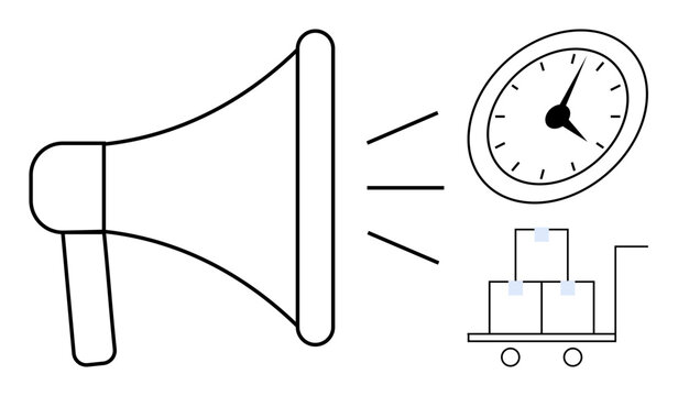 Megaphone projecting sound waves towards wall clock and wheeled pallet with boxes. Ideal for time management, logistics, delivery services, communication, efficiency, urgency, simple flat metaphor