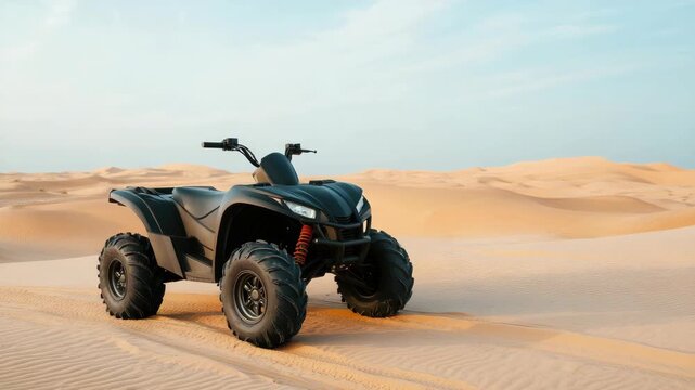 Exciting journey across vast sandy landscapes featuring an all-terrain vehicle against a backdrop of rolling dunes