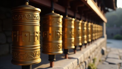 View of ornate, dark prayer wheels lined up against a vibrant orange wall, adorned with white dots, casting shadows in Diqing, Yunnan, China.