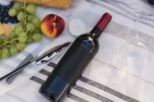 Mockup of a bottle of whine lying on a white cotton carpet during a picnic. Having lunch in a public park with red wine fruit, cheese and baguette. Copy space for you lwine logo, design or text