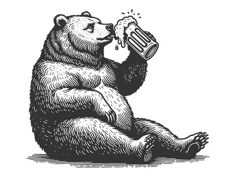 bear drinking beer from mug, humorous and whimsical elements with artistic detail sketch engraving generative ai fictional character raster illustration. Scratch board imitation. Black and white image