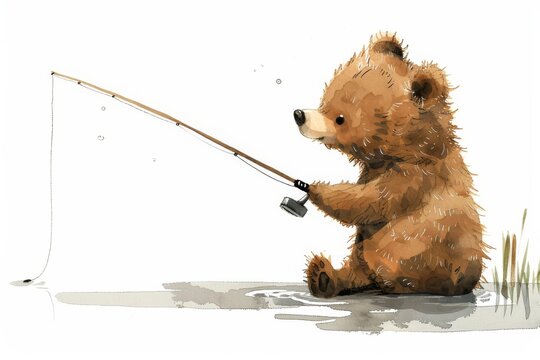 A whimsical watercolor illustration of an adorable bear cub, patiently fishing by the waterside