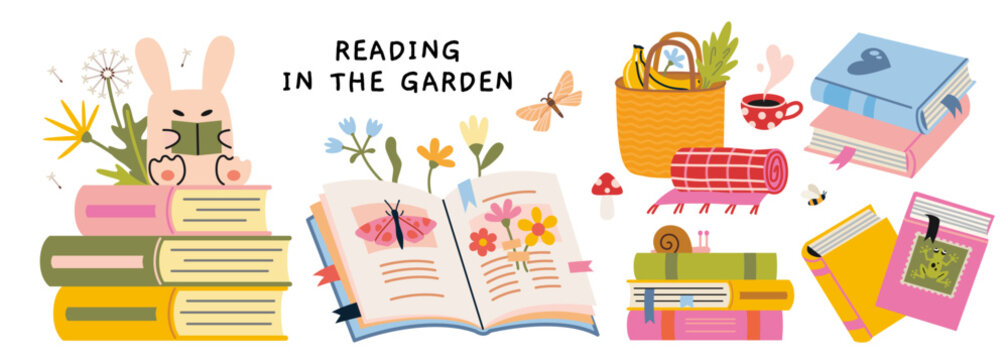 Summer set with books, flowers and cute details for garden reading and relaxation. Trendy modern vector illustration isolated on white background, hand drawn, flat design
