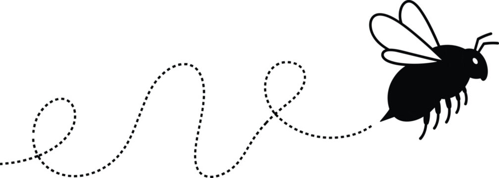 Cute flying bee illustration with dotted flight path, playful insect artwork, whimsical bee trail design, nature graphic element