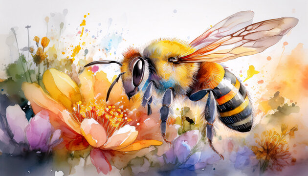 A beautifully rendered watercolor illustration of a fluffy honey bee gathering nectar from a vibrant flower amidst colorful splatters. Generative AI.