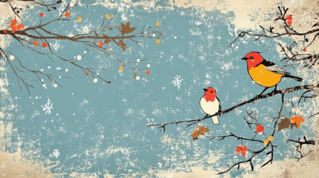 Colorful illustrations of exotic birds on branches in a whimsical style