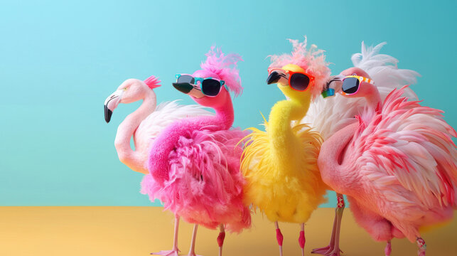 Flock of Fashionable Flamingos in Vibrant Outfits for Birthday Party Invitation or Advertisement with Copy Space