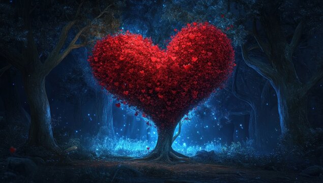 Enchanted forest of love a heart shaped tree glowing with romance and dreams
