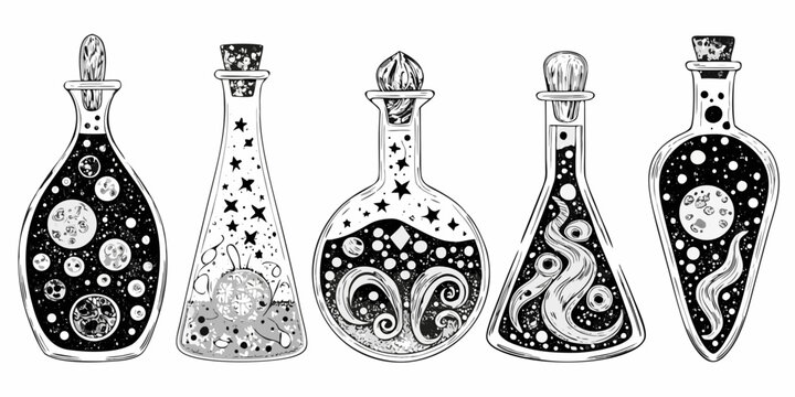 Collection of five whimsical black and white potion bottles filled with celestial and magical elements