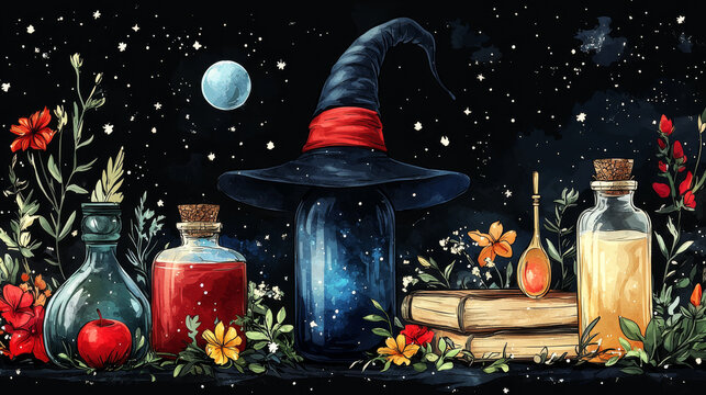 Whimsical Halloween scene with a cauldron, colorful potion bottles, bats, candles, and trees in a dark, enchanted forest setting.