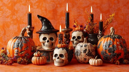 Whimsical scary pumpkins with skulls, candles, witch hat on orange
