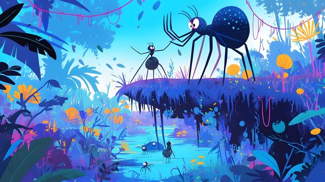 Colorful and imaginative drawing of whimsical spiders in a vibrant landscape, adding a playful and surreal touch to nature-inspired scenes