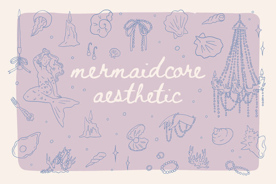 Whimsical mermaid vector elements set. Mediterranean mermaidcore illustrations. Summer coastal wedding invitation. Siren witchery sea. Ocean aesthetic bachelorette party clipart stickers collection