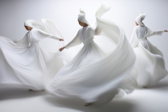Sufi whirling dance with white dress on a white background and with a motion blur effect
