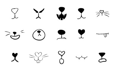 Pet mouth comic cute line doodle drawing. Set lips, noses and whiskers animal characters. Funny heart nose, hand drawn faces.