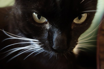 Close up of black cat with green eyes and white whiskers