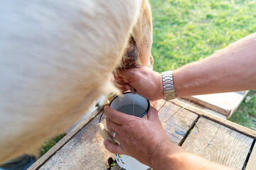 Closeup of hands milking a goat