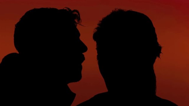 A man whispering a secret in the ear of a woman. Silhouette shot, red background.