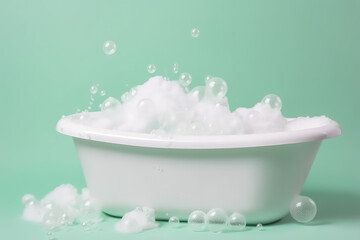 Classic white bathtub with soap foam and bubbles isolated on flat pastel green background with copy space. Generative AI professional photo imitation. Minimal style.