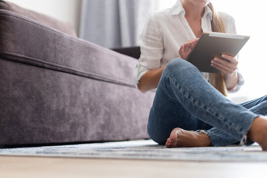Fashion model in a blouse and jeans barefoot on a white backgrou