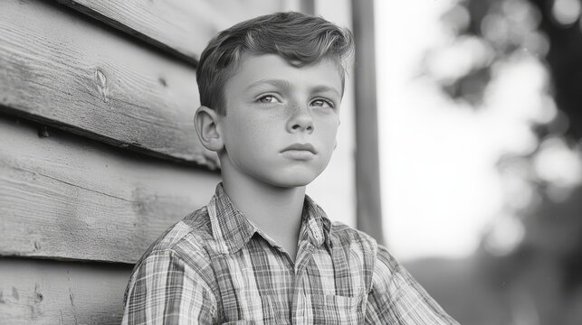 A retro portrait of a typical boy from the 1950s, in black and white tones, depicting cute children wearing classic clothing, hairstyles, and accessories, reflecting the innocence of childhood