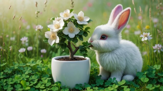 Adorable white rabbit enjoying a sunny spring day in a meadow.
