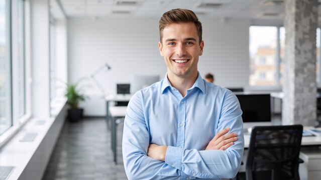 Confident young businessman smiling at the camera with arms crossed. Portrait of a happy professional male employee in a modern office workplace