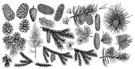 Spruce branches, pine, cones sketch set. Brushes, wreath, line borders. Christmas tree decor elements for invitations, card, banner. New year holiday vector. Nature Winter template