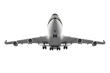 Front view of airplane isolated on white background. business airline journey or trip, aircraft vehicle with wings, jet for travel and transportation in tourism, commercial, engine, flying.