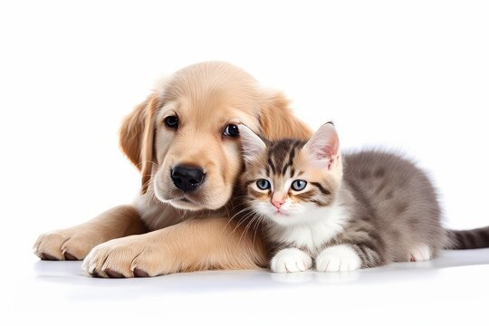 Cute little kitten cat and cute puppy dog together isolated on white background.
