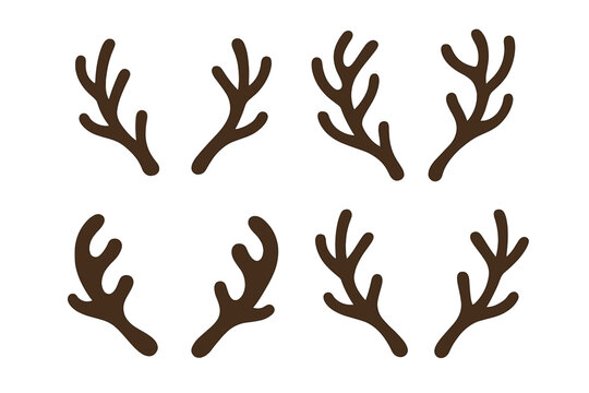 Set of reindeer antlers. Christmas design element. Vector silhouette collection. Holiday festive decoration. Brown deer horns icon. Fun photo booth prop. Xmas costume accessory.