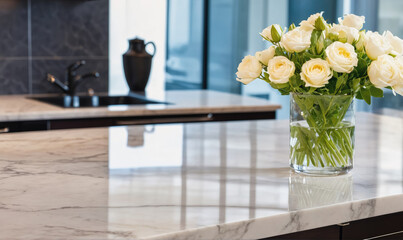 Elegant white roses in ceramic vase against soft background. mothers Day. copy space