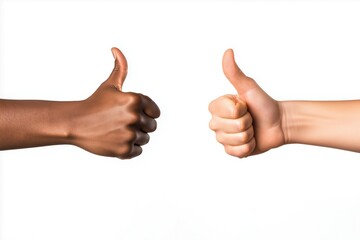Two hands giving thumbs up one dark skinned one light skinned on a white isolated studio background