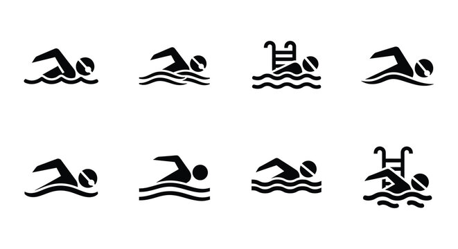 Silhouettes of swimmers in various styles and positions on a plain white background