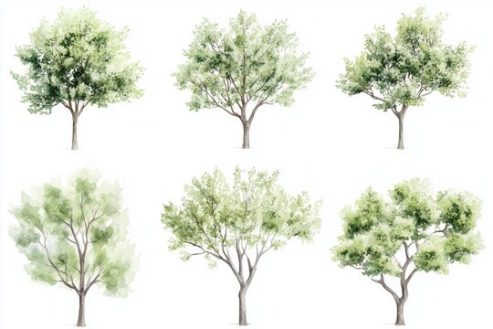 Set of watercolor green trees isolated on a white background, ideal for landscape and architectural drawings, environmental elements, gardens, and botanical spring sections