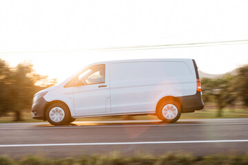 White modern delivery small shipment cargo courier van moving fast on motorway road to city urban suburb. Busines distribution and logistics express service. Mini bus driving on highway on sunny day