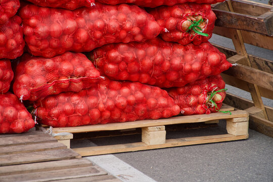 Large red mesh bags filled with onions stacked on wooden pallets at rural wholesale market, farm harvest ready for trade. Photo