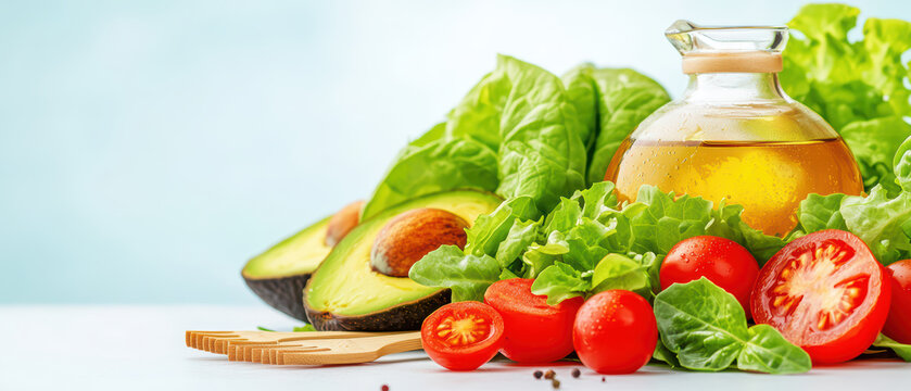 Fresh salad ingredients with avocado, tomatoes, and olive oil create vibrant, healthy meal