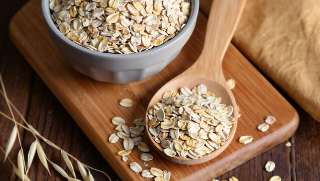 A rustic bowl and wooden spoon filled with rolled oats rest on a wooden cutting board, surrounded by scattered oats and oat stalks—evoking wholesome nutrition, natural ingredients, and cozy kitchen