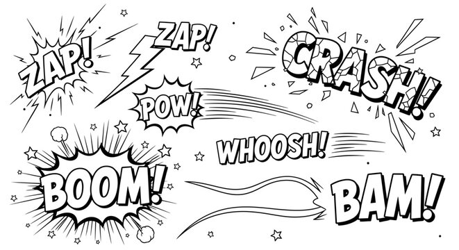 A collection of black and white comic book sound effects like Zap, Pow, and Crash in a pop art style.