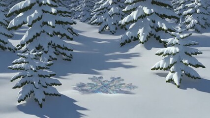 3D Animated Christmas Themed Sparkling Snowflake Whooshing Through Snow Covered Forest Touching Snow Revealing Top View.