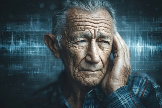 Worried senior man experiencing tinnitus symptoms, hearing loss and mental health problems, audiogram sound waves in the background representing his hearing test results