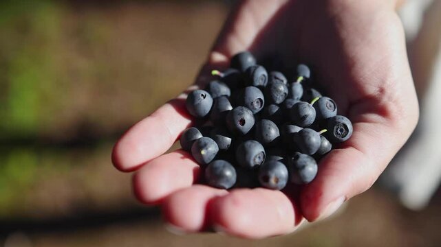 Harvested berries, process of collecting, harvesting and picking ripe berries in the forest, close up view of hands with bilberry, blueberry, blackberry, strawberry and raspberry growing, berry farm