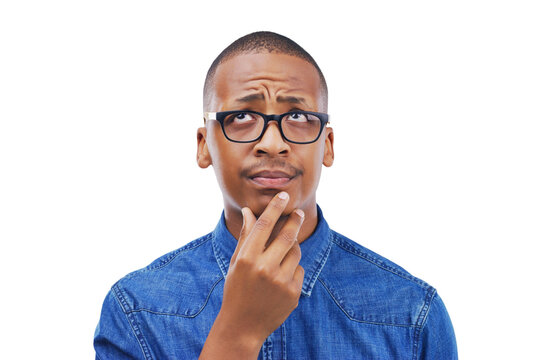 Black man, thinking and confused by question, why or remember idea for planning on isolated, transparent or png background. Doubt, guy and hand on face for solution, problem solving or brainstorming